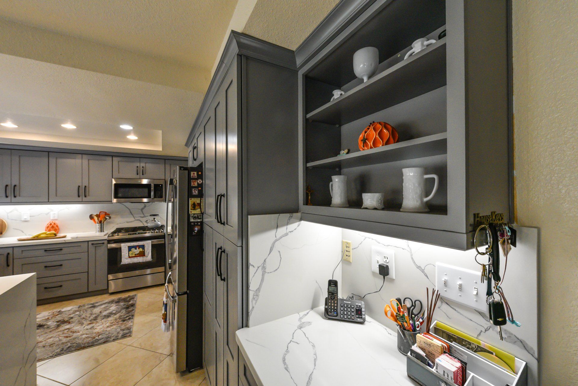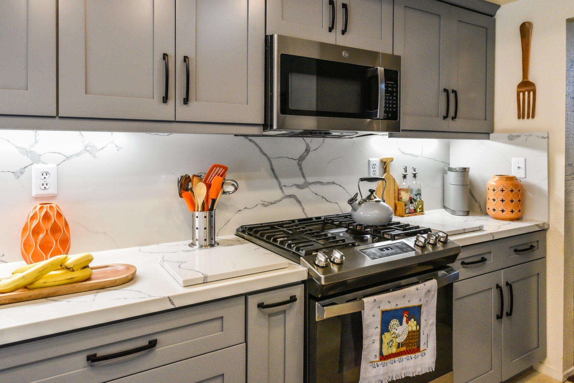 We brought in the custom granite countertops, white with simple gray veining, not only for the countertop but also up the backsplash, that lent to an air of sophistication.